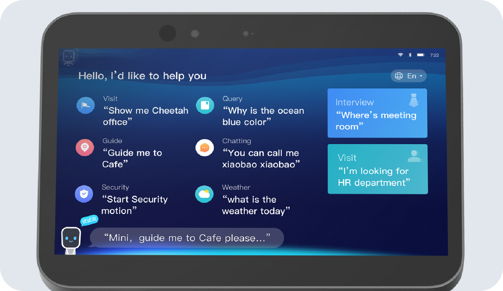 6マイク構成で75dBの騒音下でも97%の音声認識精度。30言語以上をサポートし、自然な会話と案内が可能です。